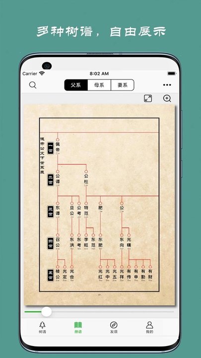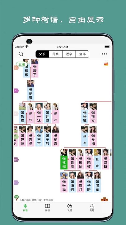 三种家族树。完美的家族树展示,独创称谓自动计算功能,让您可以清晰的查看五服内所有的关系脉络。"父系""母系"家族树完美的展示了具有共同祖先的所有子孙。