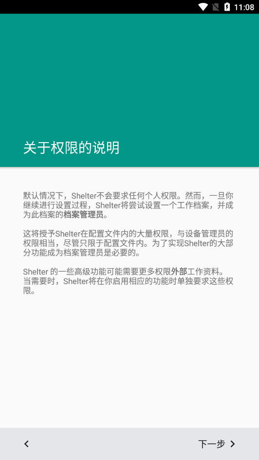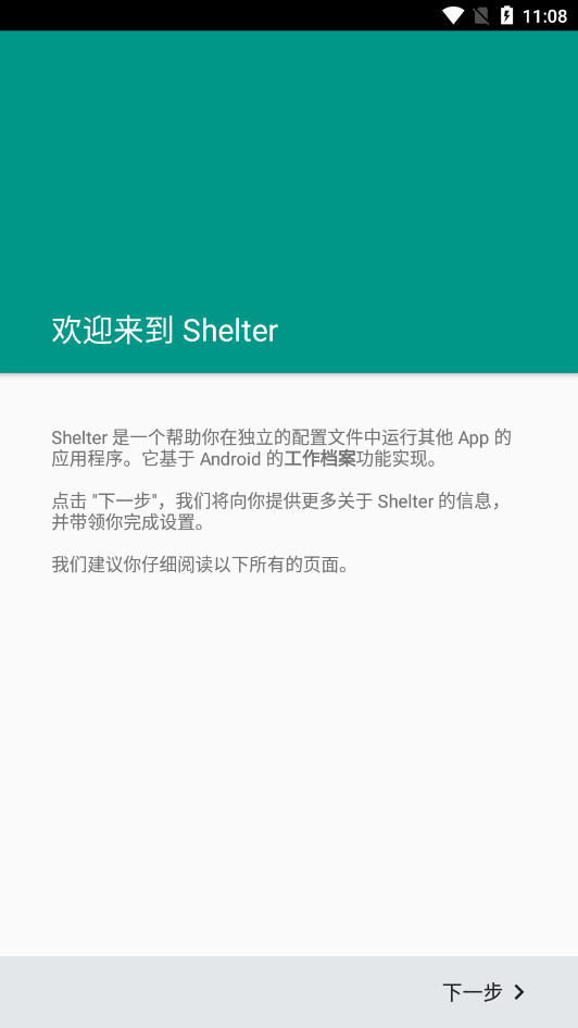 除了需要创建新的工作空间外,Shelter本身不需要获取任何权限或隐私,因此无需担心信息泄露的问题。