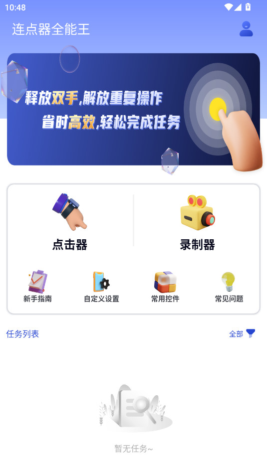 "连点器全能王"是一款专为安卓用户设计的自动化操作工具,旨在通过智能化的连点、录制与模拟功能,极大提升用户在日常使用及游戏娱乐中的操作效率。它集自动连点、一键录制、手势模拟、多点触控于一体,操作简单易上手,无需ROOT权限,即可在全局应用中自由使用,是您的生活与游戏双重得力助手。
