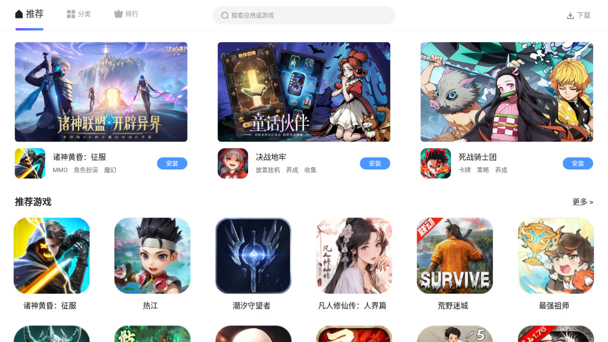 1、进入首页,推荐类会为你推荐当下热门的游戏资源,这里选择你喜欢的游戏类型,点选【安装】。