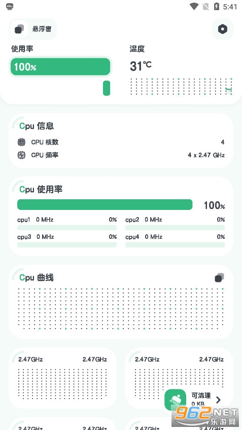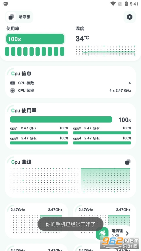 《cpumonitor》是一款专业手机CPU监测工具,实时精准监控负载、温度及频率,支持多核分析与历史数据统计。内置一键清理加速功能,提供电池、内存等实用小部件,界面简洁且资源占用低。更可深度检测设备硬件信息,助力手机性能优化与降温,让运行更流畅。