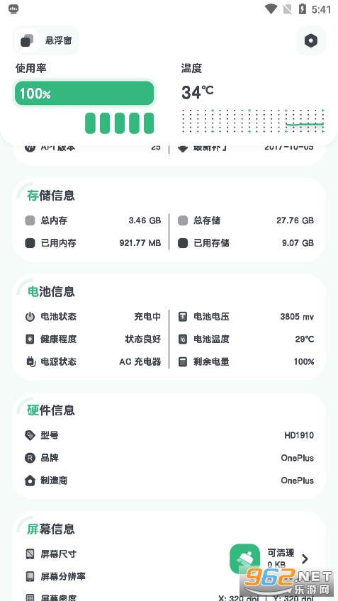 内存:总计和可用RAM,以及有关设备的存储信息。