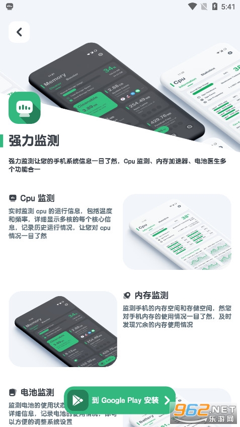实时监测CPU的温度和频率,分析CPU温度和频率的历史使用数据,并且支持多核CPU频率的同时监测,同时提供各个应用的CPU温度排行榜。CPU监测提供一键清理加速功能,随时方便的清理内存。