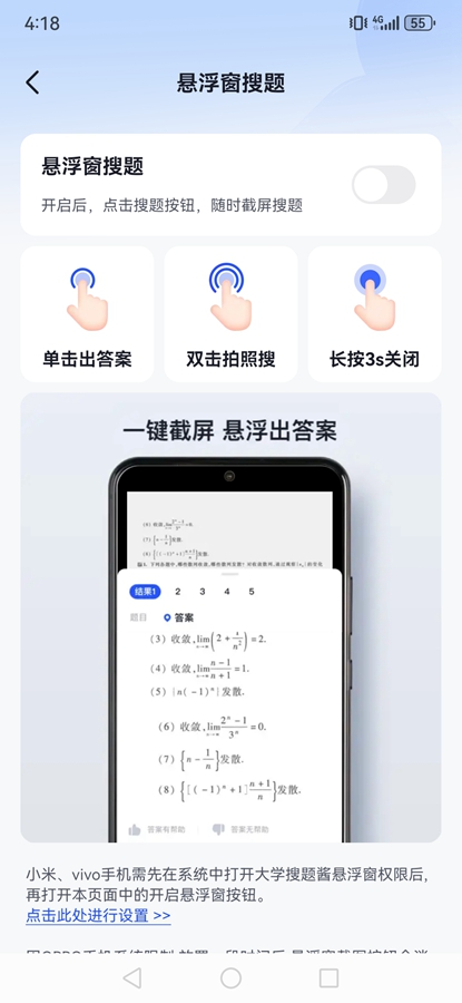 3、找答案浮窗:手机在线答题如何查答案?开启找答案浮窗,截屏搜题更方便!