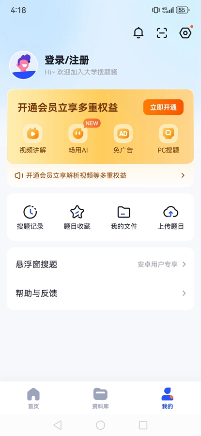 然后进入【大学搜题酱app】,点击【我的】-【悬浮窗搜题】