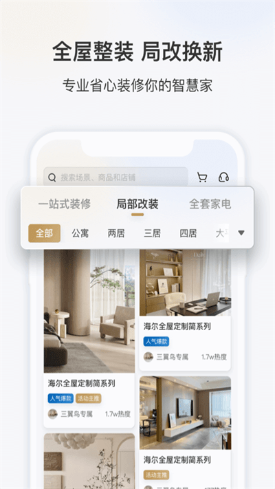 海尔智慧场景定制品牌的官方应用,为您提供智慧家庭全场景解决方案,这里每一个设计,每一个施工都是大家都可以关注到的,可以让互联网走进自己的生活,并且平台全流程管理,可以给予2265用户更智慧舒适生活体验。可以在生活中提亚各种互联网带来的方便哦!