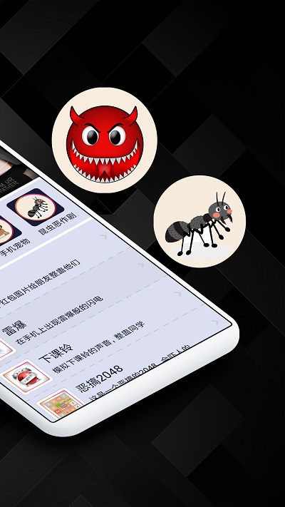 本应用拥有数十种恶作剧的方法:火炎屏幕,整人变声,系统异常,魔鬼恶作剧,恶搞屏幕,桌面宠物,昆虫恶作剧(老鼠恶作剧,甲虫恶作剧,蚂蚁恶作剧,蜥蜴恶作剧,还有蛇在屏幕上爬等),假红包,雷爆,下课铃,2048整蛊,真假话测试,恐怖光线,电击屏幕,屏幕碎了,整蛊锁屏等功能。