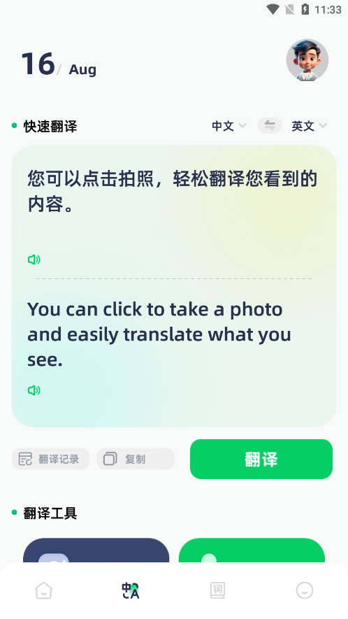 3、在中英互译部分,可以自由调整语言的翻译,如果不想手动输入的话,也可以通过拍照的方式获取释义解读,之后复制到你需要的语境下应用。