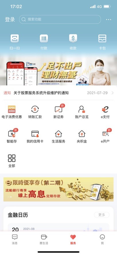 智服务:“金融日历”让您理财规划不用愁,“猜你喜欢”为您推荐爆款金融产品,还有更便捷的工银e支付、无卡取现、网点预约等服务等您体验。