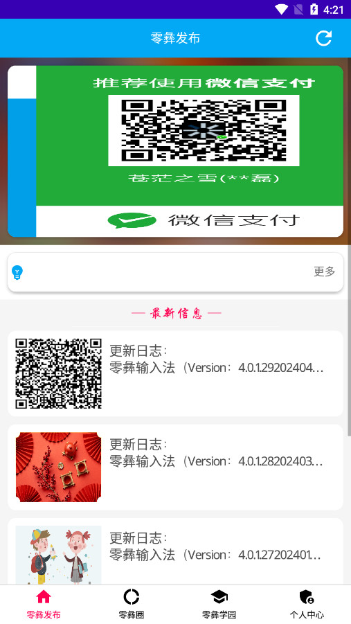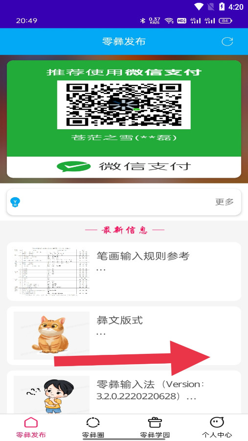 1、进入零彝输入法可以看到,软件共分为零彝发布、零彝圈、零彝学园以及个人中心等四个部分。