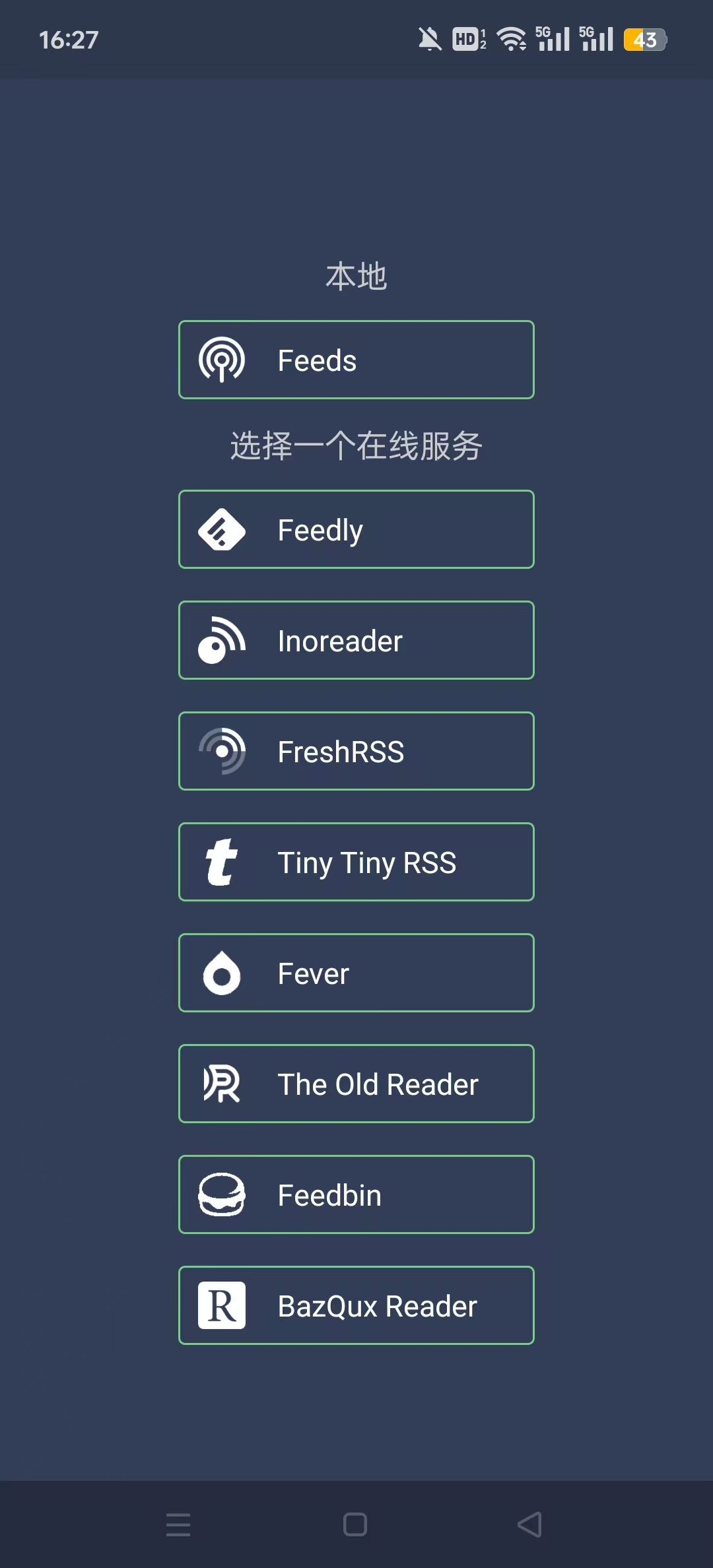 1、下载安装FocusReader rss阅读器以后打开,选择一个在线服务,这里推荐【Feedly】。