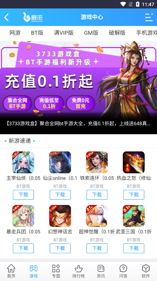 2、在【游戏】这里,有各种热门网游、BT版、满VIP版、GM版、破解版等众多好玩的游戏,当然你也可以根据新游速递榜单来安装和下载。