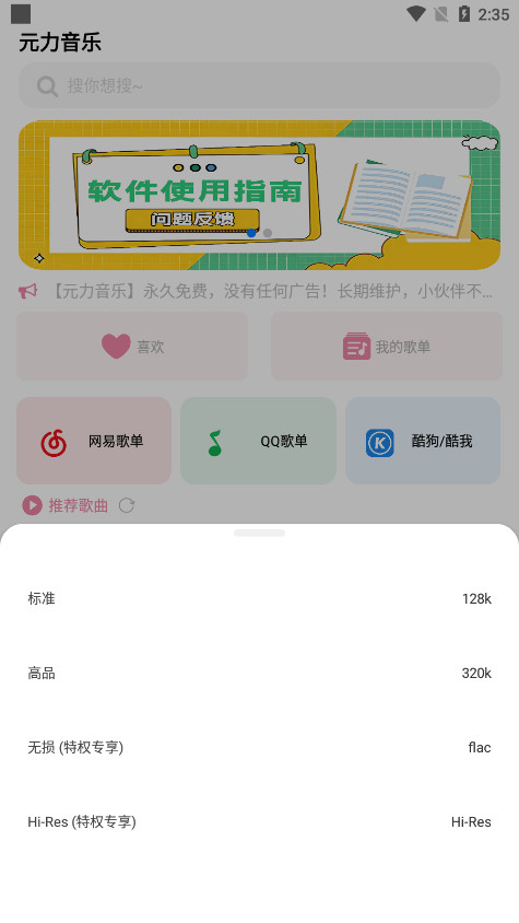 元力音乐app无需VIP、无需看广告、而且不需要注册和登陆就可以进行听歌了,软件不仅能够在线播放和收听音乐,还支持免费下载高品质的无损音质歌曲。在听歌曲的页面显示为特权专享,但实际上可以完全免费下载。