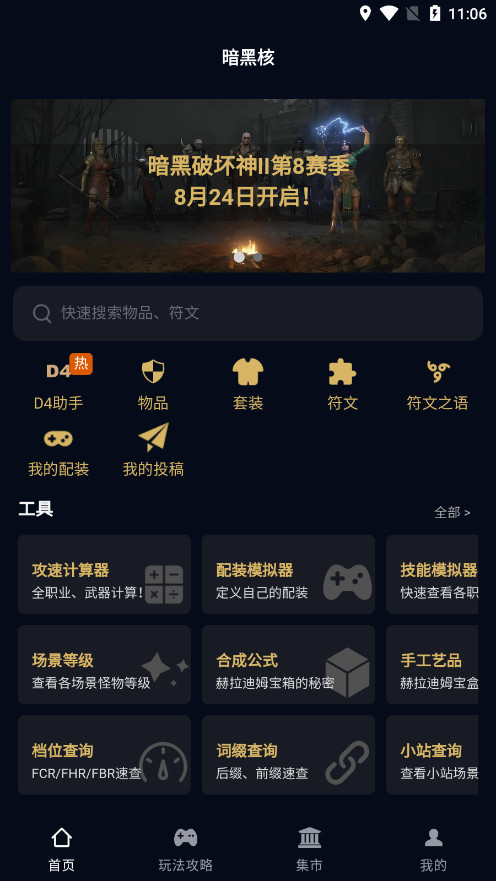 《暗黑核》是专为《暗黑破坏神》系列玩家打造的全能辅助工具,集配装模拟器、技能加点推荐、集市交易等核心功能。软件内置全系列装备数据库,支持关键词搜索快速查询属性与获取方式,搭配实时更新的版本动态与玩法攻略,助您精准把握游戏节奏。技能模拟器可自由搭配BD方案,模拟实战效果避免资源浪费,更有攻速计算、打孔规则查询等实用工具,满足从新手到资深玩家的多样化需求。
