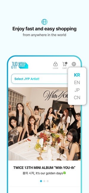 提供韩语.英语.日语.汉语等4种语言的服务,预计全球粉丝们可以更加方便地使用与JYP艺人相关的多种商品。