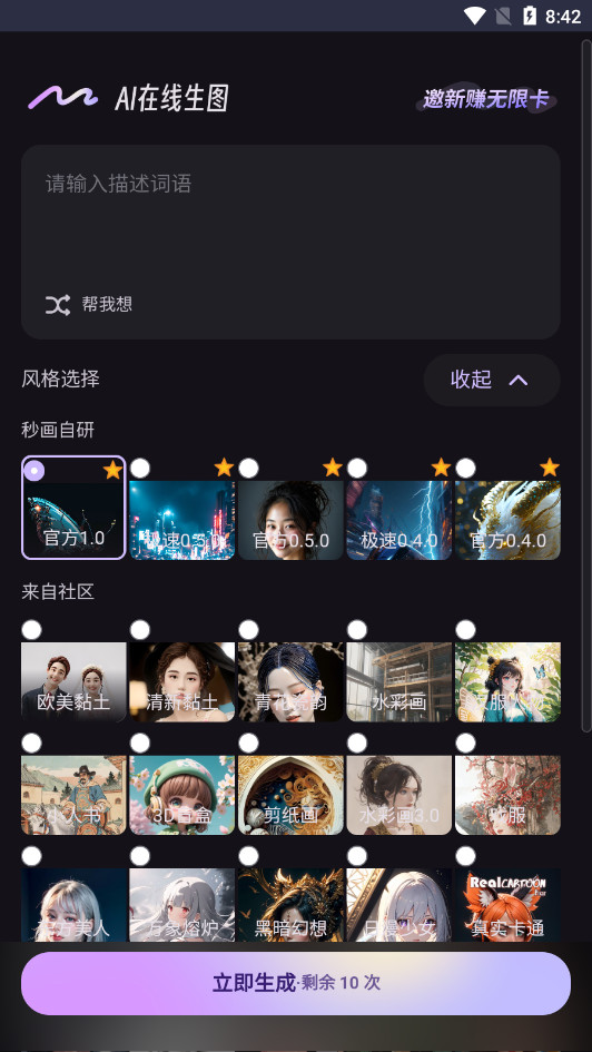 1、新人用户注册登录后免费获得10次AI生成的机会,如果想要获得更多,可以点选【邀新赚无限卡】。