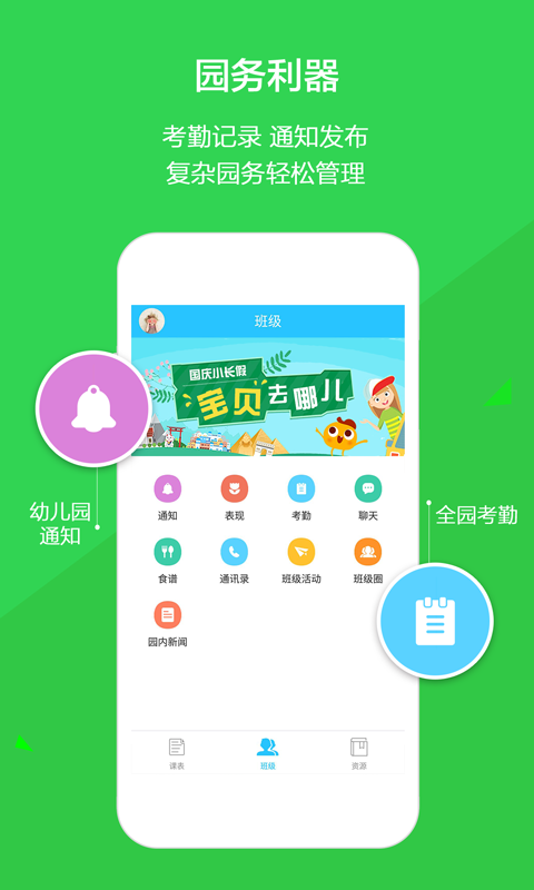 云宝贝面向3-6岁入园儿童的家园互动产品,家长、课堂、园区三端互动,家园共育陪伴孩子快乐成长。云宝贝园丁版专为幼儿园园长和教师设计,方便园长管理考勤、发布通知,方便教师规划课程、自我提升,教务园务更简单!