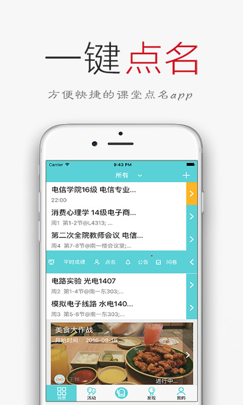 4、应用场景:查寝、上课、会议、活动,一键点名、一键签到。