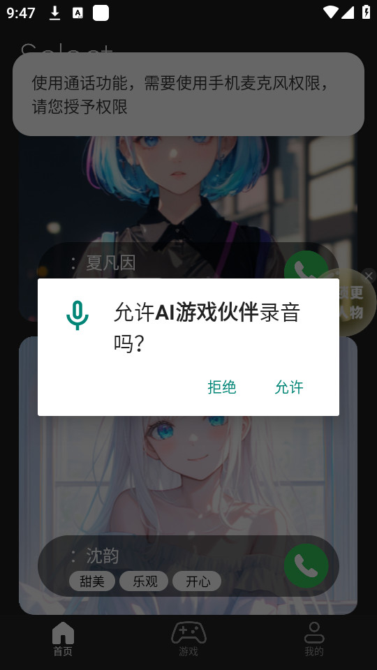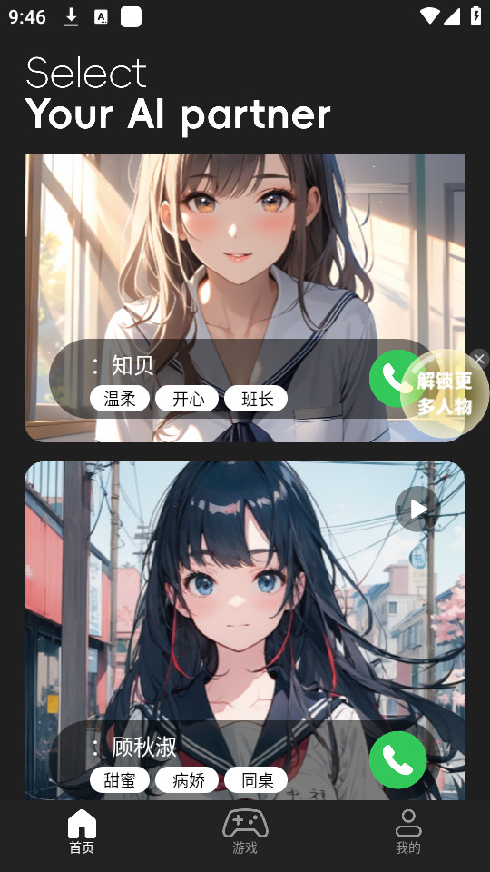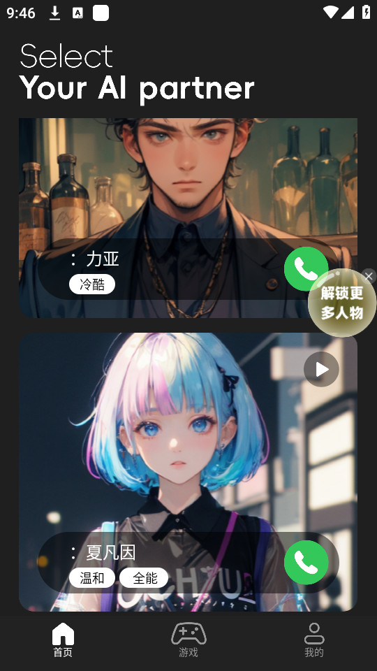 进入ai游戏伙伴首页之后点击你喜欢的角色的电话按钮