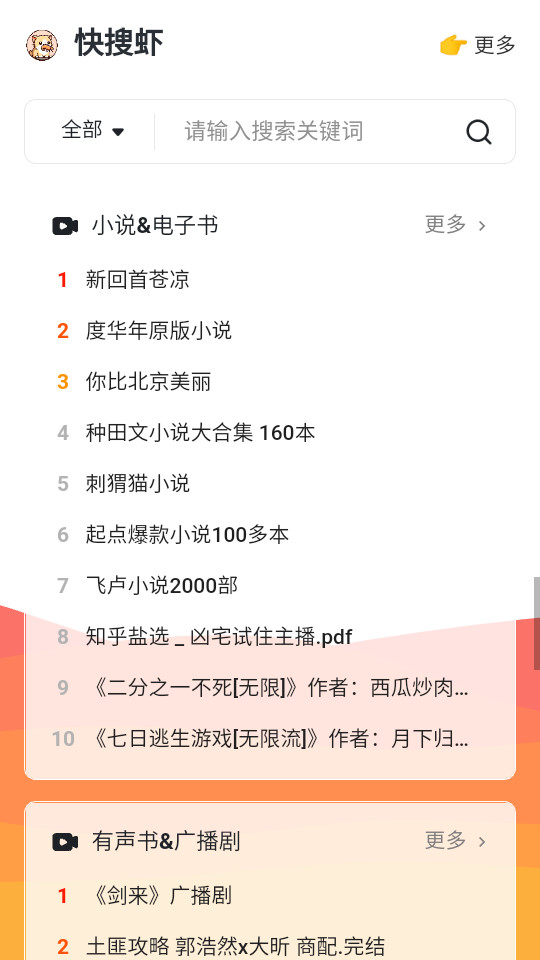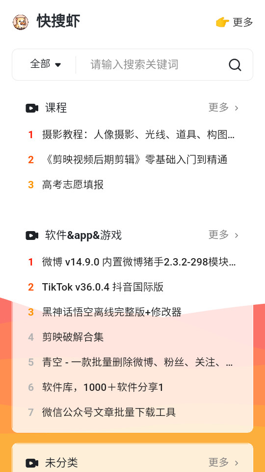 《快搜虾app》是一款非常实用的手机资源软件,软件体积小巧,界面干净,无广告、无插件打扰,提供纯粹的使用体验。支持多种资源搜索,包括各种不同的资源,内容丰富,满足用户多样化需求。部分资源支持在线预览功能,用户可以先查看资源内容再决定是否下载。提供一键下载功能,简化下载流程,提升用户体验。