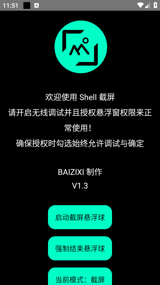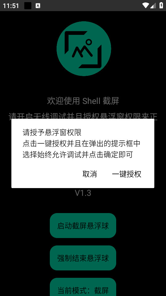 下载安装并打开shell截屏app,点击一键授权