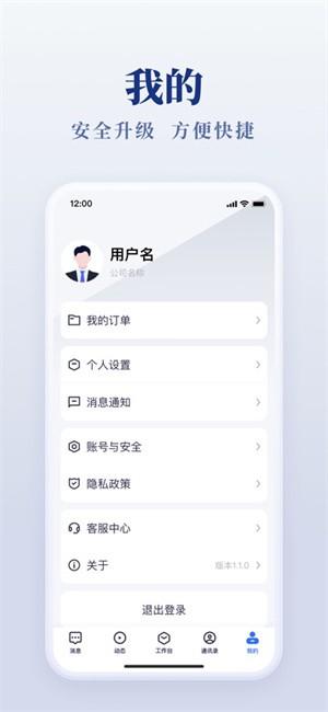 该应用界面主要包括用户登录、“消息”、“动态”、“工作台”、“订单”、“我的”个人信息以及系统设置和更新、在线客服和帮助,