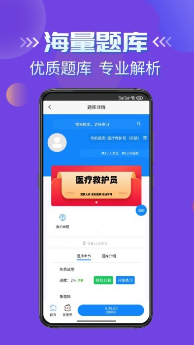 医疗救护员考试学知题app为用户们提供了海量的医疗方面知识,可以更好的去进行学习,各种题目训练复习,巩固自己的知识点,还有历来的真题试卷进行学习使用,满足于不同的使用需求,非常实用的,一起来这里看看吧!