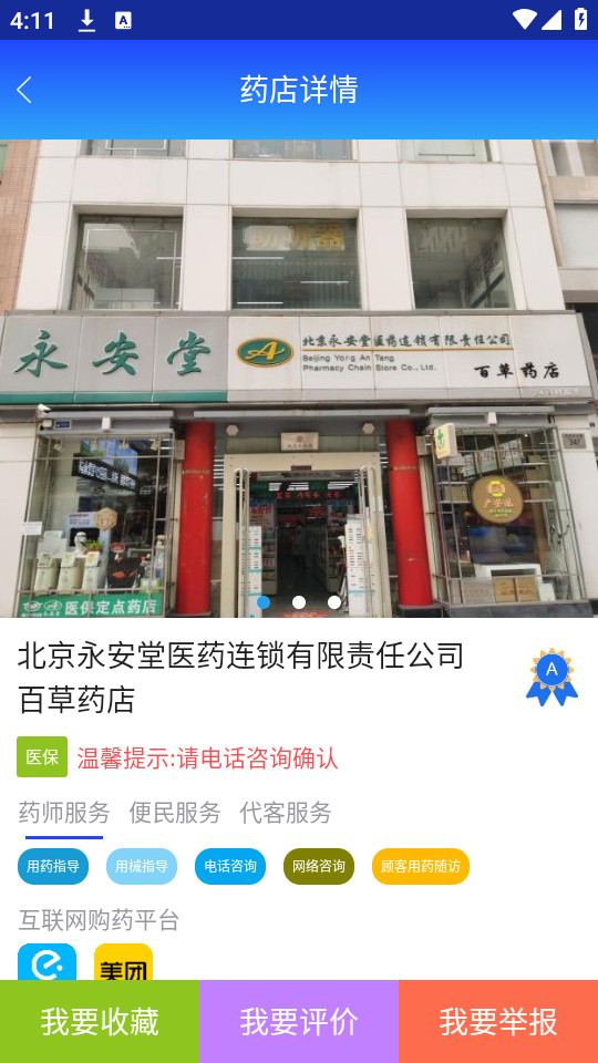 公众通过查找附近药店快速查看到附近药店的分布情况,药店地址、直线距离、是否医保、营业时间、在售药品等药店信息。通过常用药品分类和搜索查看药品详情,包括药品通用名称、批准文号、生产厂家、规格等药品信息。通过查找药师获取到药店信息。通过药事药闻了解到新的科普知识。为公众直观的展示了药店、药品、药事药闻等信息,提供便捷服务。