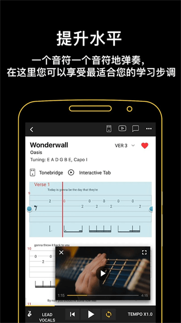 主要包括吉他和尤克里里琴的和弦、记谱法、歌词目录等内容,即使离线可以移动。支持各种不同乐器的在线学习,帮助用户能快速提升自己的乐器技能,可以上手演奏,吹拉弹唱不同的乐器。还能通过Tonebridge吉他音效还原演奏15000+首流行歌曲。学习弹奏自己最喜爱的歌曲!软件还提供了便利的线上乐器练习功能,帮助用户能掌握高效的练习服务!