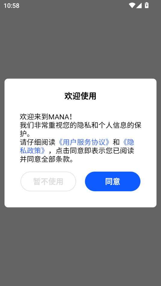 下载安装并打开mana app,点击【同意】同意隐私政策