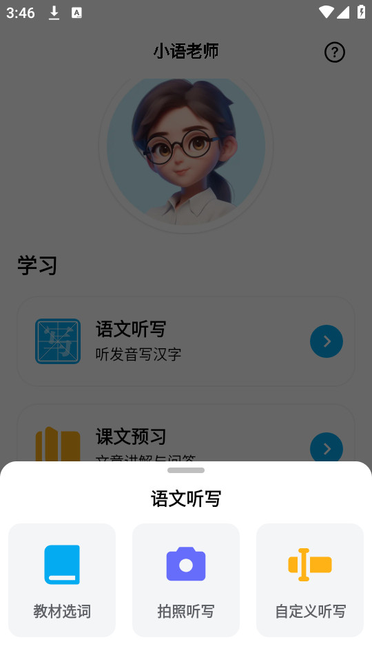 2、进入主页,选择【语文听写】点击,下方会出现弹窗;