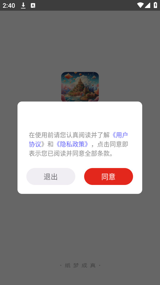 1.下载安装并打开纸梦成真app,点击同意,同意隐私政策