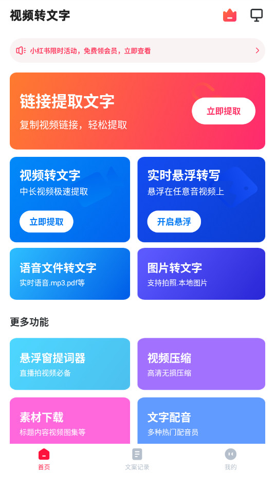 《视频转文字》是一款功能强大的自媒体提取文案效率工具,支持复制视频链接提取文字、视频转文字、实时语音转文字、音频转文字、图片扫描转文字等多种功能。