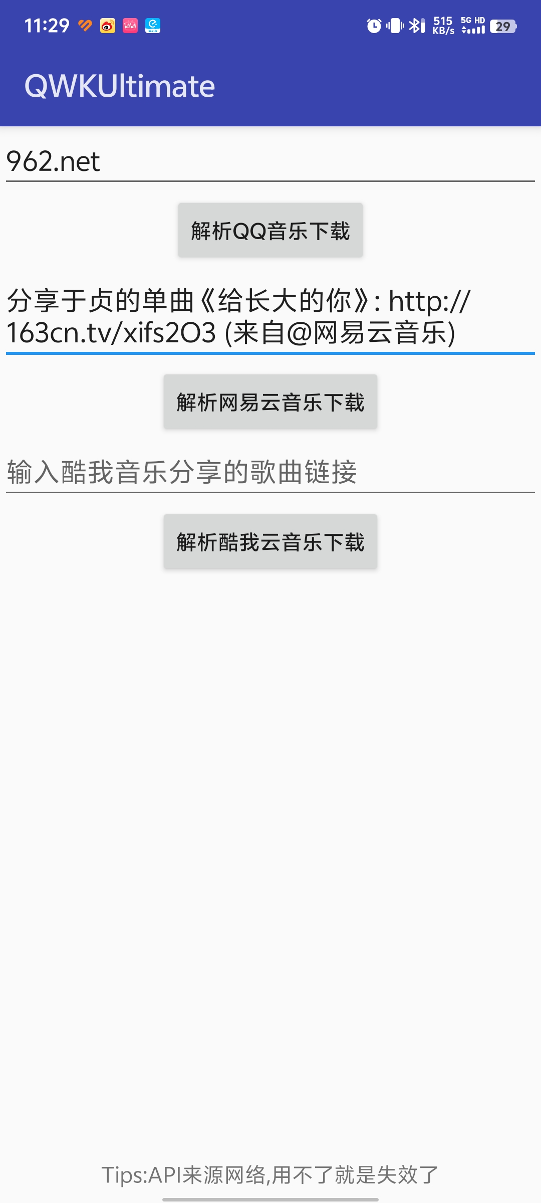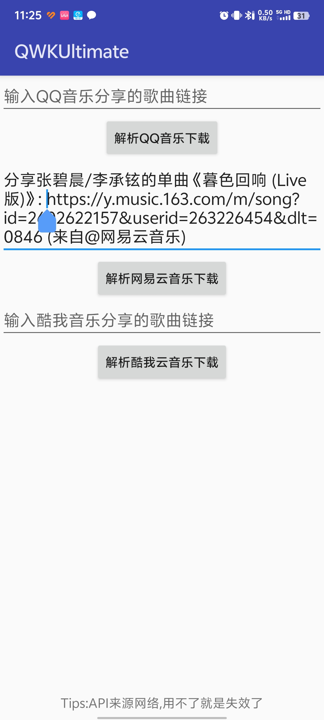 输入你需要下载的歌曲链接放在合适的地方,并且点击对应的解析按钮