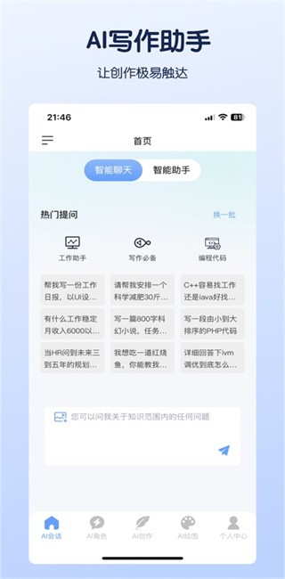 进入ai会话功能,提供ai聊天,ai助手两种模式可以自由切换