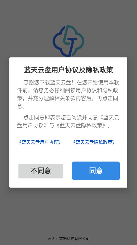下载安装并打开蓝天云盘app,点击同意,同意隐私政策
