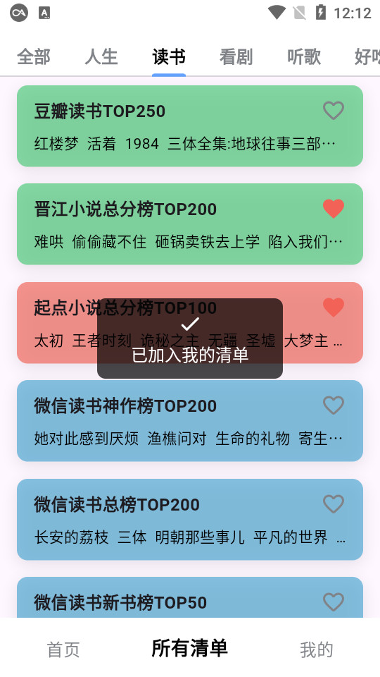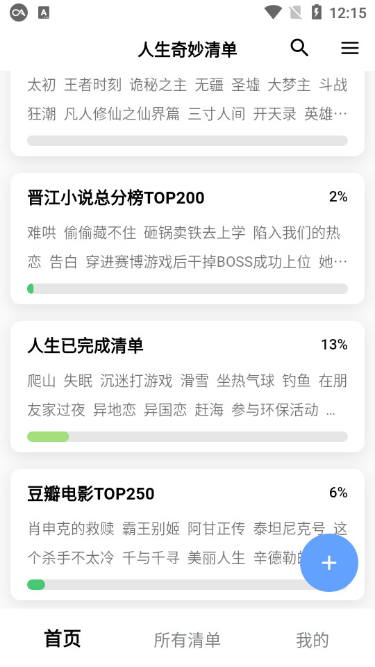 所有清单上方可以选择各种不同分类的清单进行添加