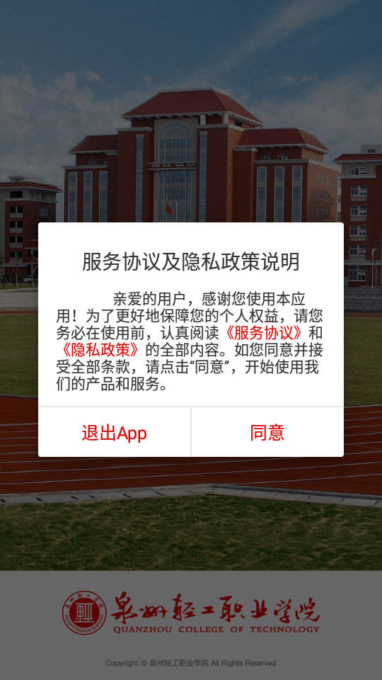 下载安装并打开泉州轻工学院app,点击同意