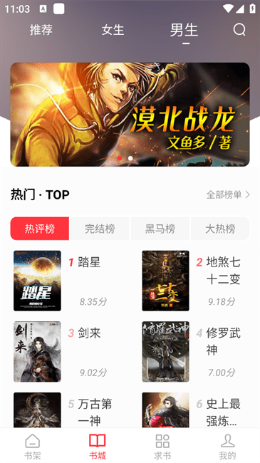 2.接着在【书城】可通过分类、推荐或快捷搜索的方式找到感兴趣的小说并点击进入