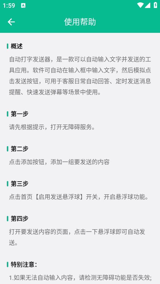 《自动打字发送器》是一种能够自动完成打字并发送消息的手机软件,用户可以提前设定好需要发送的内容,当需要使用时,只需点击即可自动发送,无需手动打字。特别适合游戏快速发送指令、一键发送消息、主播留言、发帖、快速评论等场景,能够大大提高用户的沟通效率。在提高沟通效率和便捷性方面具有显著优势,适用于多种场景和需求。