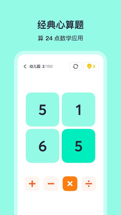 算24点app是具备全新数学益智教育体验应用软件,特别是想要提高大脑反应速度和心算水平的人群。有15个等级,300个精心设计的关卡;界面设计非常简单整洁,能够轻松满足各种类型用户群体操作使用,更多便捷体验方式参与适合所有人;对该软件感兴趣的朋友们可以来本站下载体验一番!