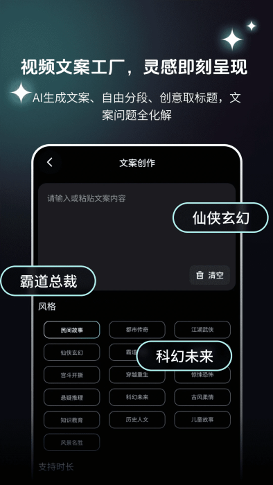 输入基础文案,秒变文案大师。选择民间故事、科幻未来、历史人文等风格,并选择限定时长,即可生成适配的广告文案、朋友圈文案。零基础也能轻松打造爆款脚本,解决账号运营中的文案创作难题。