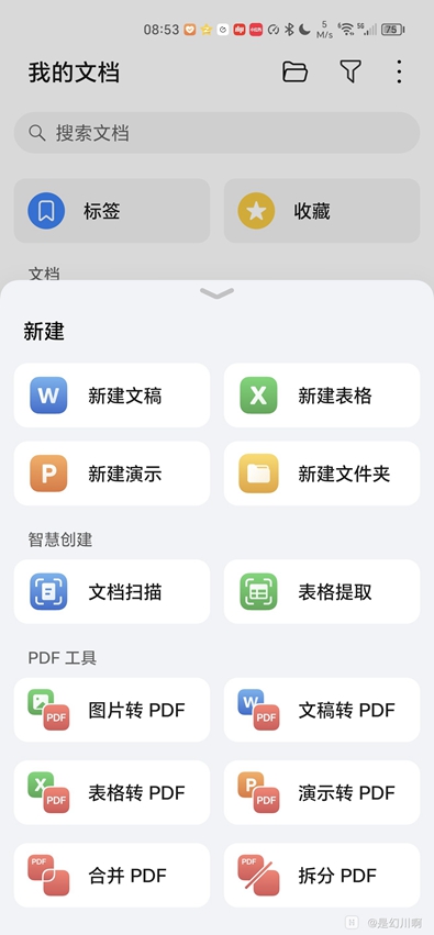 《荣耀文档app》可快捷实现文档的收集、整理、查看、编辑等。首先,通过荣耀office APP,我们可以直接新建文稿、表格、演示、文件夹,也就是办公常用的Word、Excel、PPT都可以直接在这里新建,不用再去下载第三方的办公软件了,而且APP界面也是非常直观简洁的,可以快速上手使用,不用担心不习惯的问题。