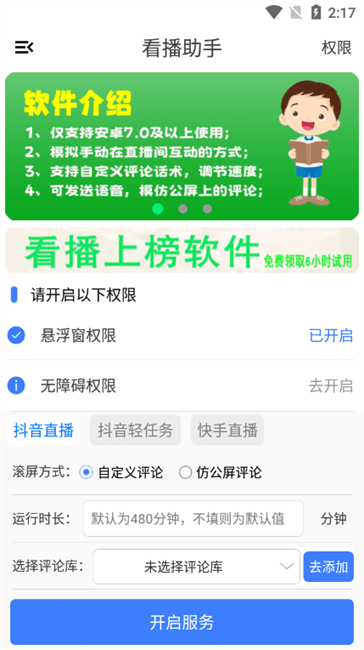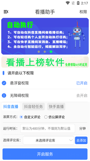 看播助手2025新版本app官方免费版是直播涨粉的神器,包含了各个主流直播板块,用户可以在这里设定直播任务自动执行,包括自定义和仿公屏评论,可以添加评论的内容,支持设定滚屏运行的时长,轻松为直播间加人气。