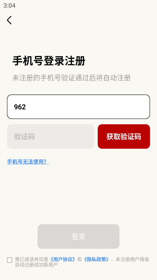 2.输入手机号和验证码之后点击【登录】,勾选隐私协议,没有注册过的手机号就会自动进行注册
