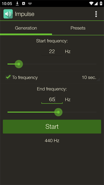 进入软件后在【Generation】自定义“Frequency”频率,也可勾选“To frequency”至频率来自定义“End frequency”结束频率后点击“Start”进行开始即可呈现对应的音频赫兹