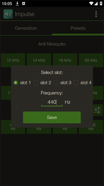或是直接点开【Presets】直接选择对应的音频赫兹,分别提供了手机驱蚊器:Anti Mosquito、猫和狗:Dogs and catswhistle、用户预置:User presets
