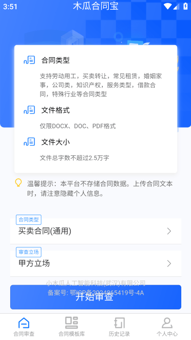 进入后你可以这里选择合同的类型,还有审查立场,在选择你的合同文件开始审查。