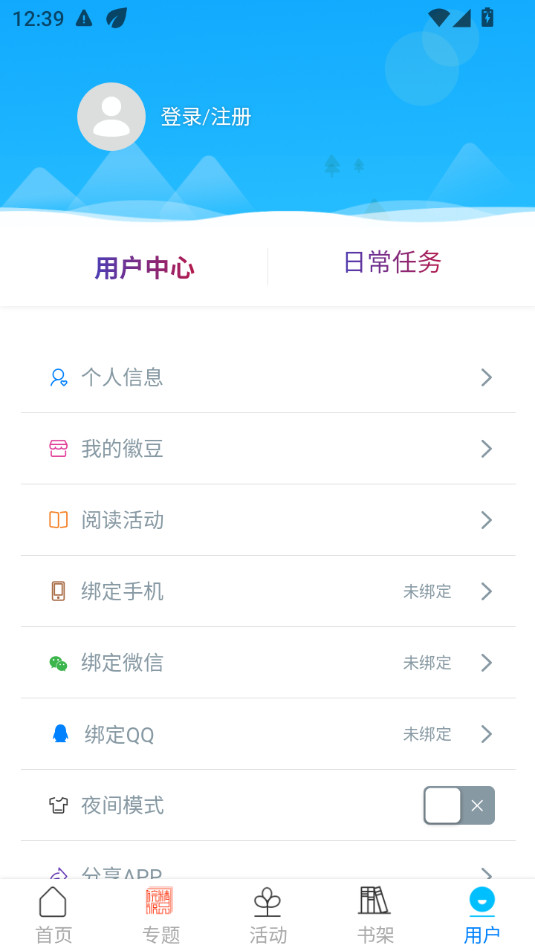 下载安装并打开数字书屋app,首页界面能够查看各种资讯,上方可以按照分类查看你感兴趣的内容,比如如果想要听书就点击上方的听书