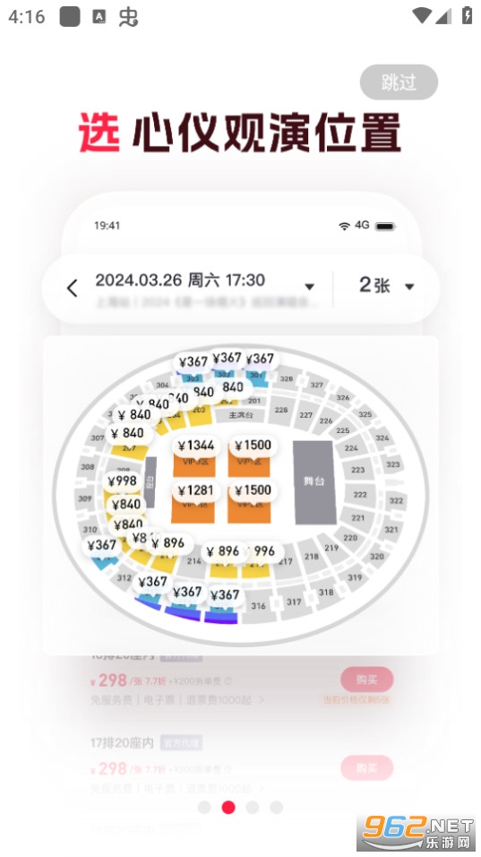 4、“VR”选座功能:推出国内首创、国际领先的“VR”选座功能,在用户购票前就能够模拟票的座位在现场的观看视角,为用户在选择票品时提供“所见即所得”的体验,此功能已申请了相关专利。